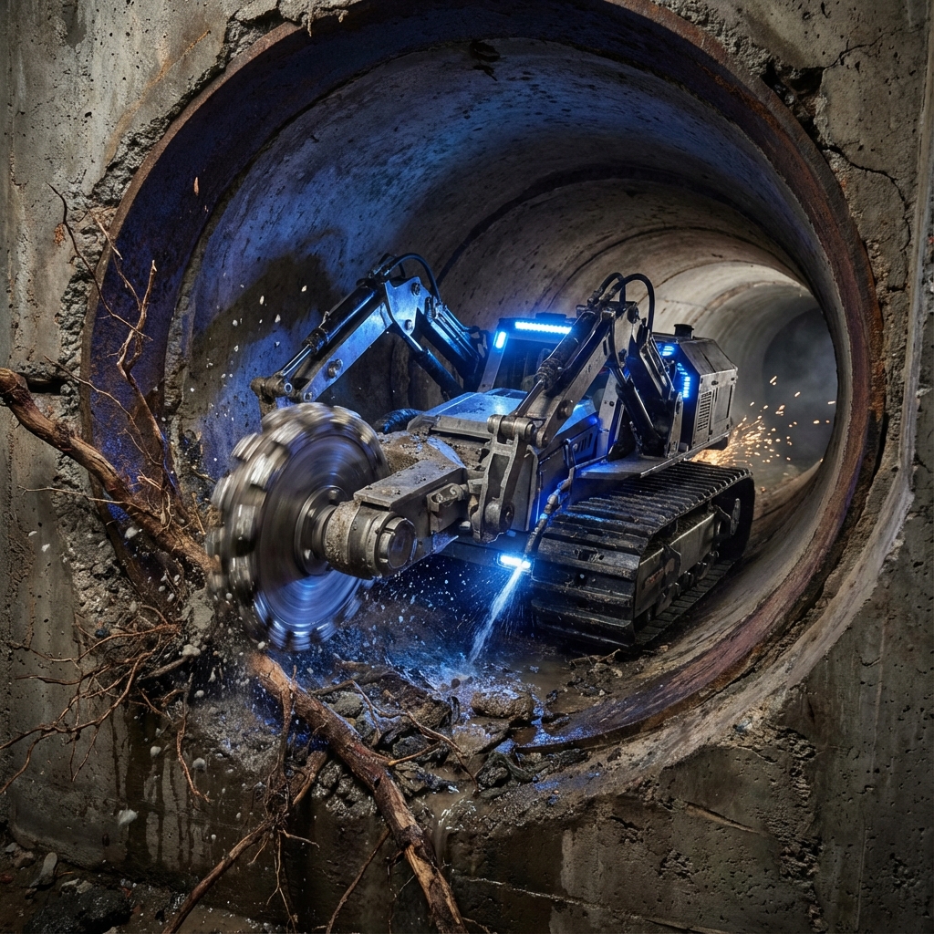 Some blockages are too tough for standard high-pressure water jetting. Concrete, heavy tree roots, protruding lateral connections, or fused liners require mechanical intervention. Our Robotic Cutting units are remotely operated vehicles (ROVs) that enter the pipework to grind away these obstructions with diamond-tipped precision.